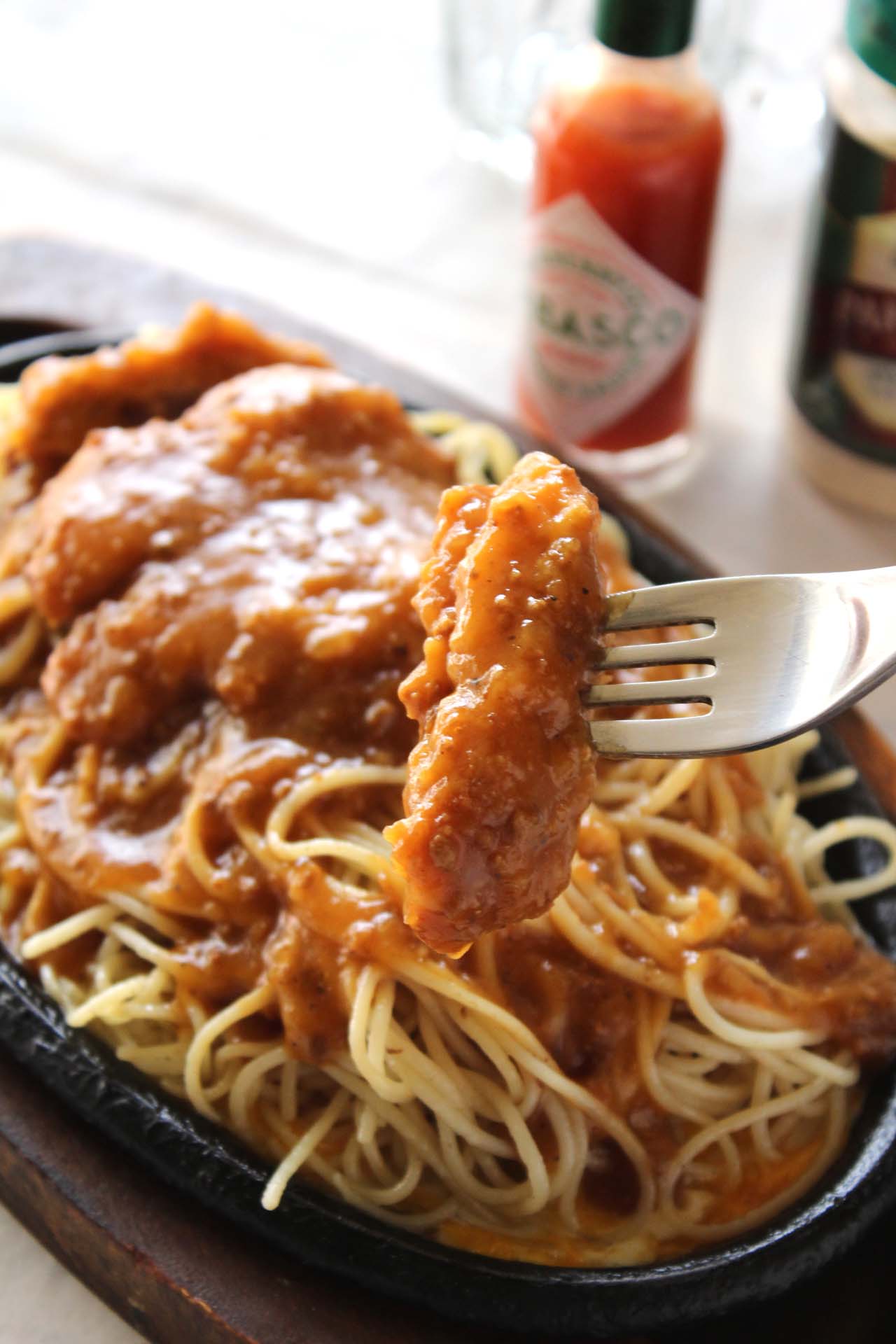 アツアツの鉄板の上に、半熟玉子+パスタ+カツ+ミートソースの[カツミートスパゲティ](650円)