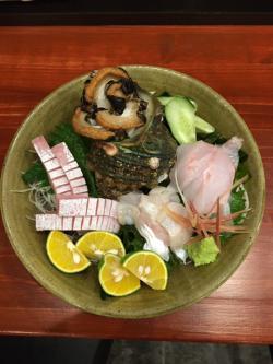 漁師さんから仕入れた新鮮な刺身の盛り合わせ、アナゴの刺身、鯛の湯引き、ハマチ、タコなどなど旬のお魚を多数お出ししています。